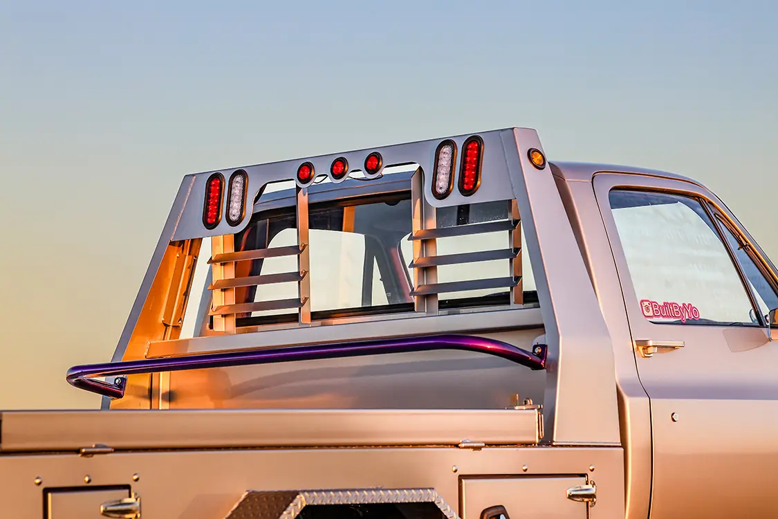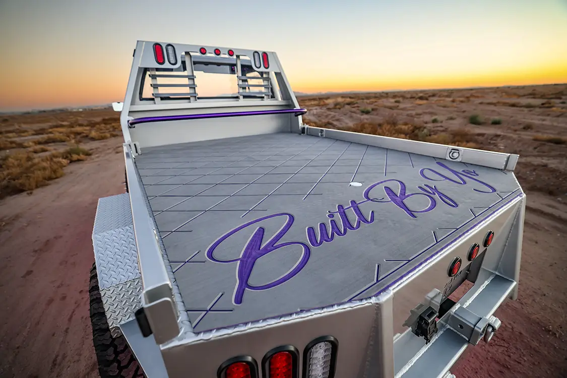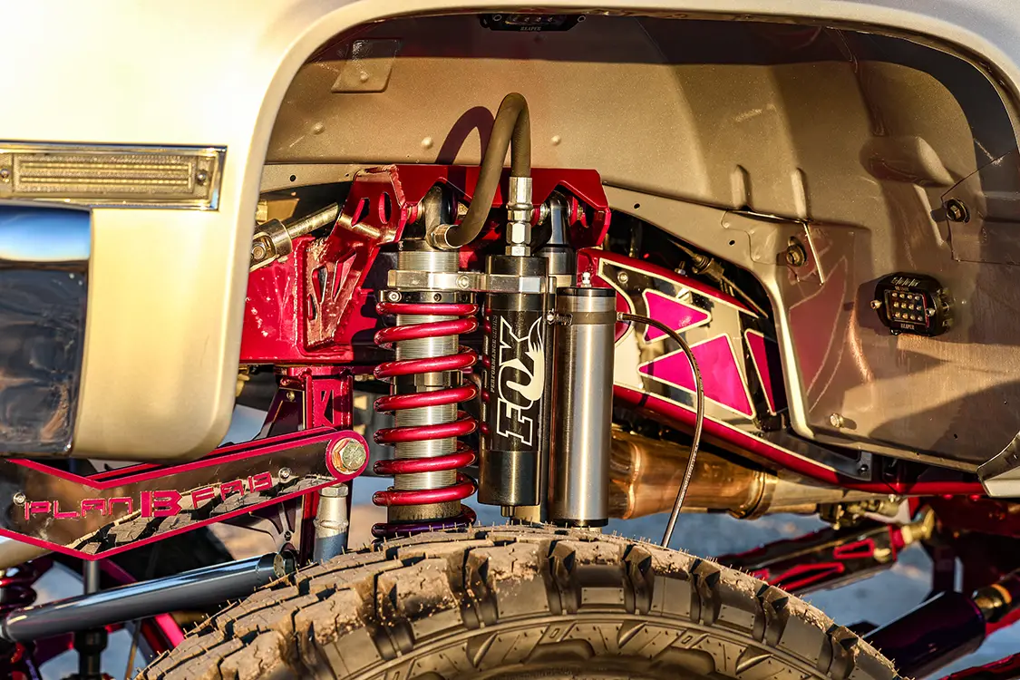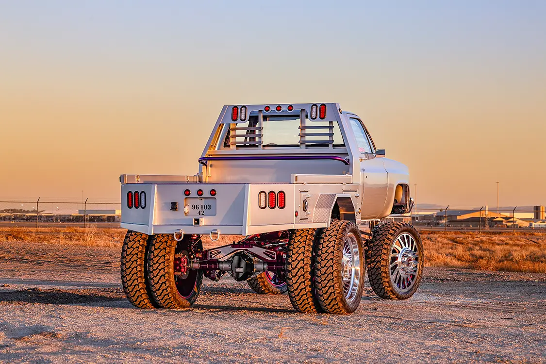 Knowing the truck had to have a massive presence, the first thing Mario did was drop the frame for the truck off with Rob down at Plan B Fab to build a custom chassis with 16 inches of lift, a custom 4-link, and a ton of Prismatic Illusion Purple powdercoating and polished overlays. Fox 2.5 reservoir coilovers and Ruthless Fabrication triple bypass shocks were used to make it ride good, while Ruthless Fab dual steering stabilizers were used to make it steer as smooth as stock. The axles were swapped for 2017 Ford F-350 units, and the rear of the truck was converted to a dually to add even more presence. For rolling attire, 30×8.5-inch Forgiato ‘Wade’ wheels were selected and wrapped in 42×13.50-30 Fury Country Hunter tires. To make this custom chassis work stand out at night, a total of twenty-six Infinite off-road rock lights were wired in.