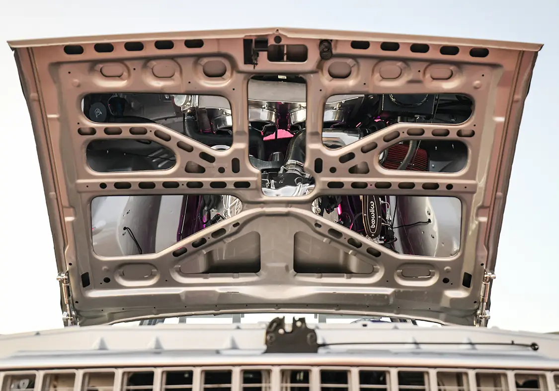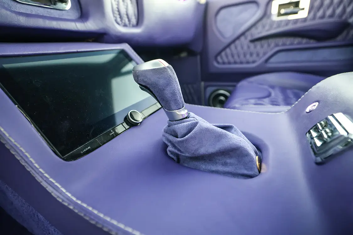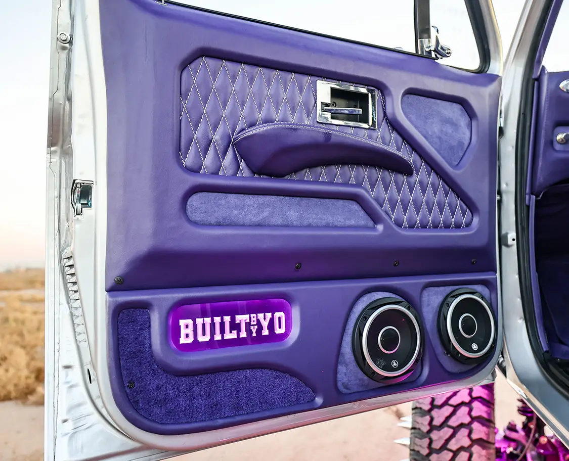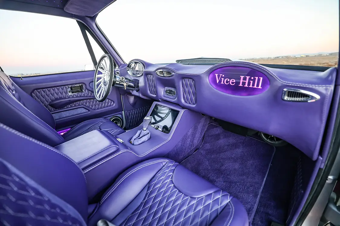 You can’t build a truck of this caliber and not have a full custom interior. For that, Mario took the truck to his go-to interior shop, Ultimate Audio in Lexington, South Carolina. Shawn Arnold and his crew made quick work of this truck to make sure it would make it for its SEMA 2024 deadline. The Ultimate Audio team built a custom dash and console with a Kenwood head unit and Dakota Digital gauges to give the interior a one-off look. They also built all-new door panels that house two 6.5-inch JL Audio speakers in each door and a custom sub box stuffed with two JL Audio 10TW3 subs that fit behind the modified 5th Gen Camaro SS seats. All interior panels were wrapped in purple vinyl, while the purple carpet and purple suede starlight headliner tie it all together. The new steering wheel was a perfect match to the Forgiato wheels, and added a nice centerpiece to the interior.