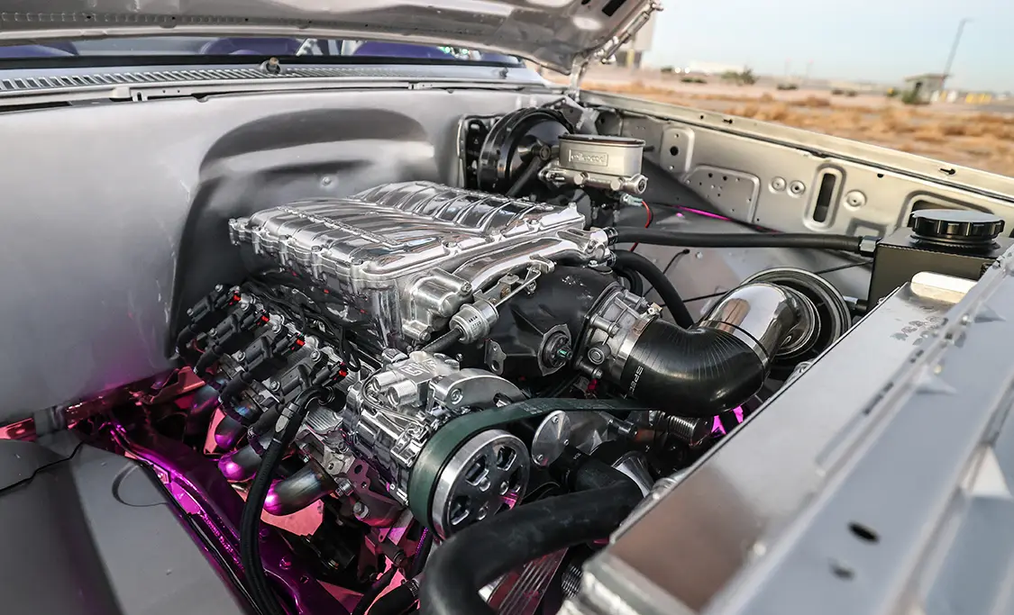 Once the chassis and body were done, it was time to put a drivetrain in that would move this beast quickly down the road. To accomplish this, Mario chose a 2019 Chevy LT4 and 10L90 10-speed transmission. Knowing he still wanted more power than that, the factory supercharger was swapped out for a Gen 5 Whipple 3.0L blower. The Entropy radiator, CVF front serpentine setup, Speed Engineering headers, Walbro 525 pump in the custom fuel cell, and the Racetronix fuel pressure regulator make sure it functions right. The Speed Engineering billet valve covers make it look good. Will Davis made sure every part of the swap meshed and operated well.