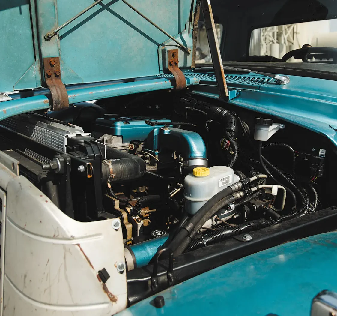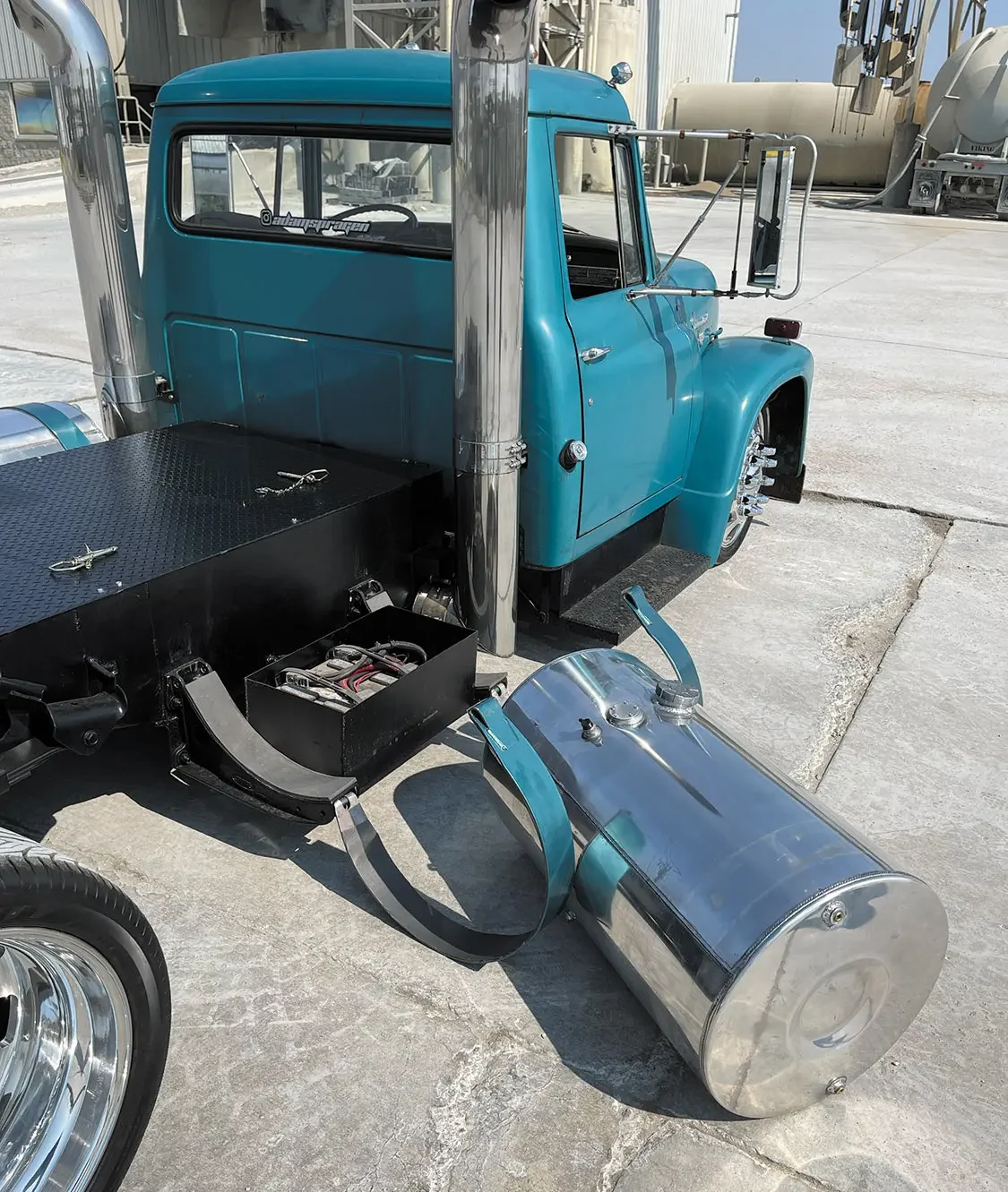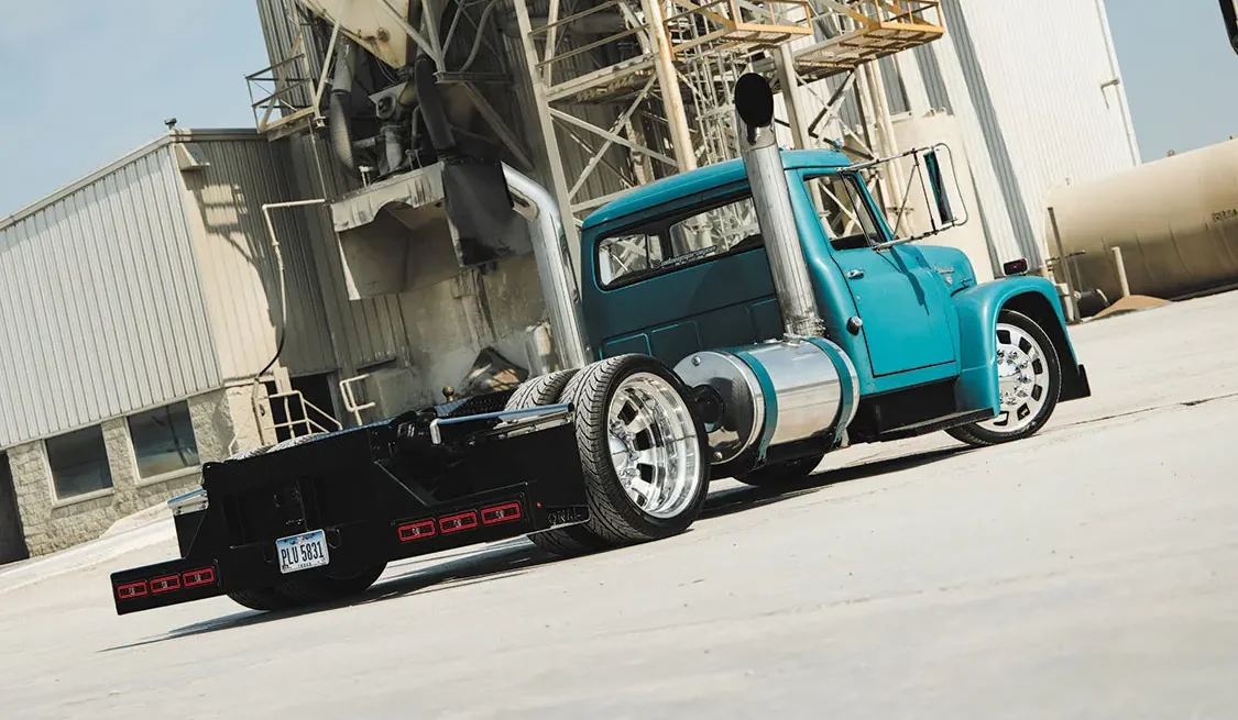 With some help from a few friends and his dad, Adam was starting to pick up steam with his Loadstar project. Even though this was his real first build that was as detailed and intensive as it was becoming, he was able to make sense of what needed to be done in order for everything to fall into place. “After making some custom pedals and steering column mounts, I then moved onto other items of the truck to get the rest of it looking right,” Adam says. “The factory International turquoise paint was still well intact on the cab, so I asked Ohio Auto Kolor out in Sidney, OH to mix up a batch of paint to color match a few accessories in the engine bay along with the fuel tank straps to add more of the classic color throughout more of the truck.”