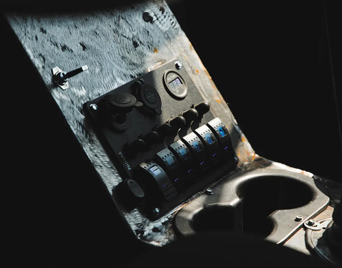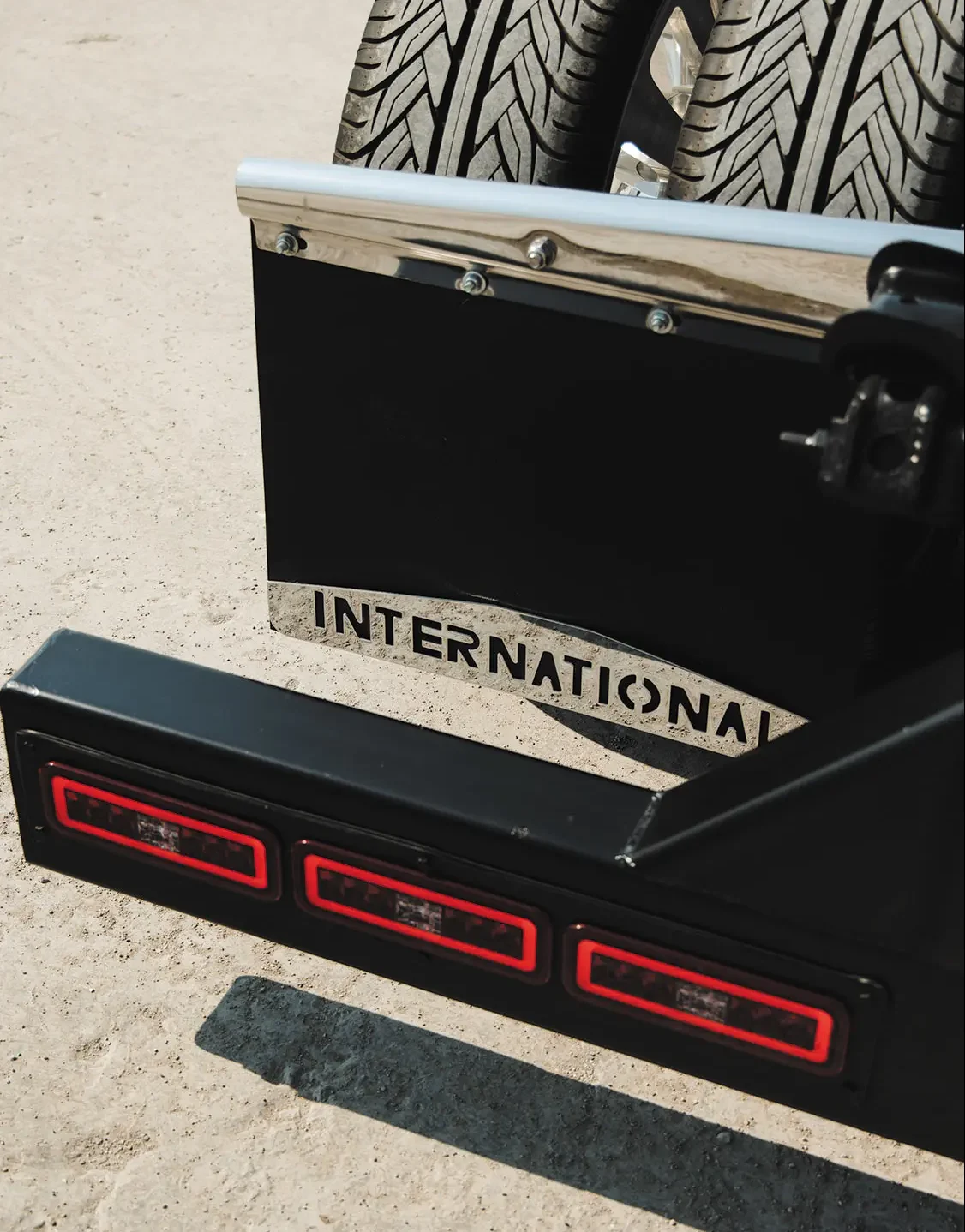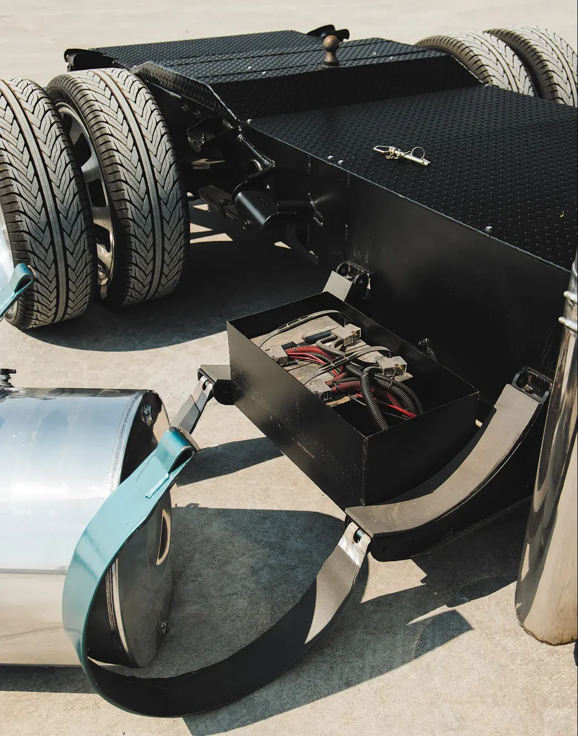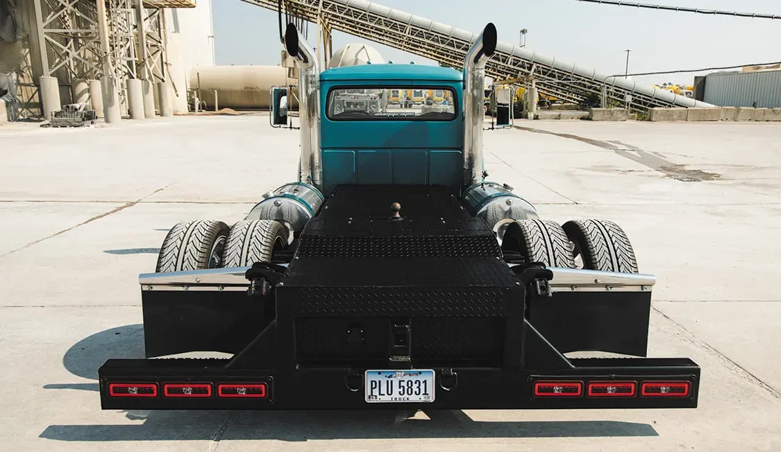 Next, Adam then leveled the rear frame rails in order to give the truck a small semi look, then cut and installed diamond plate steel panels to create a more attractive and usable surface area. One-off hangers were then fabbed to hang the rear mud flaps just before a scratch-built rear bumper complete with LED taillights was mounted to successfully modernize the rear end. The fuel tank on the driver’s side is a full 60-gallon capacity reserve, which is more than what Adam felt was sufficient enough to hit the road with. Since he really didn’t need 60 more gallons of on-board gas, the tank on the passenger side was still mounted to balance the appearance, but it’s strictly ornamental as it hides the custom battery box below it. “I felt that this was a better use for the space,” Adam comments about the modification. “Most people wouldn’t expect to see this, and it’s kind of cool to have a secret compartment somewhere on this truck.”