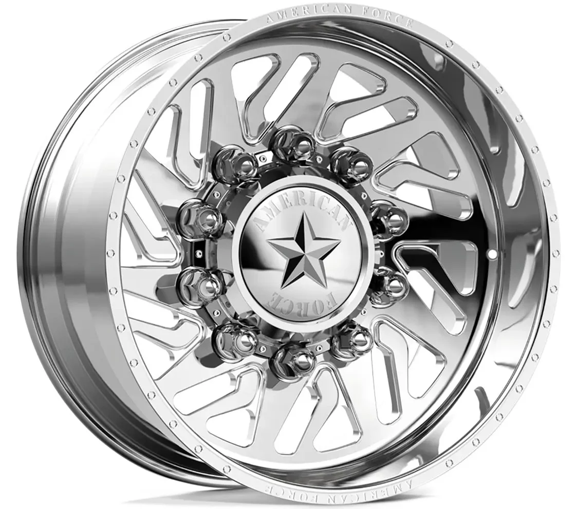 American Force designed this wheel specifically for heavy-duty dually trucks. As part of the Concave Super Dually Series, the 7N13 Derange wheel was engineered to give truck owners the ability to run a concave single wheel on the front of their dual-rear-wheel axle for a matching concave look all around. Available in 22-, 24-, 26-, and 28-inch sizes in standard polished and custom finishes.
