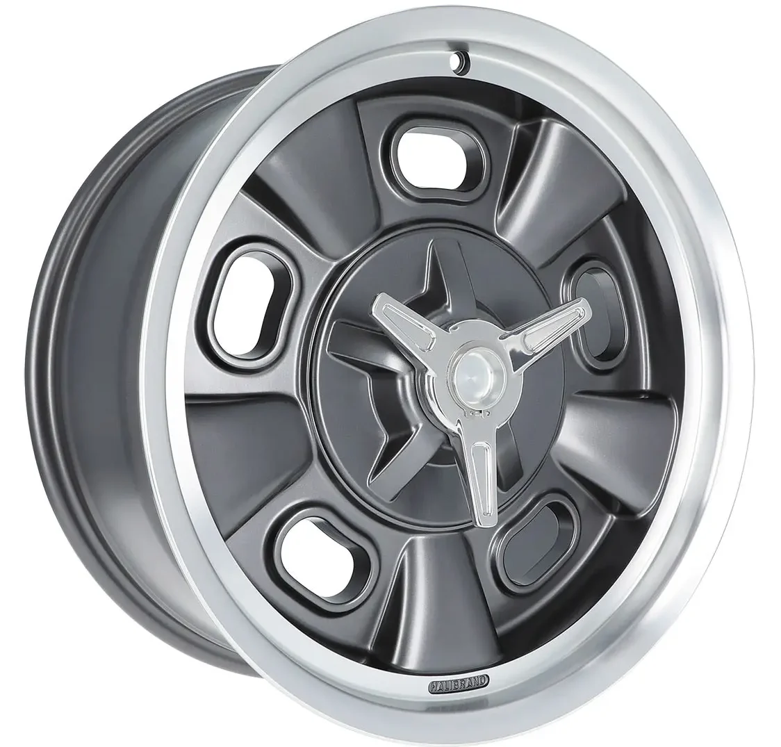 The Indy Roadster wheel with lug cover and spinner for the squarebody C10 is a nostalgically styled unit based on an original Halibrand design. The Indy Roadster has been updated to fit with modern tire sizes and tapered seat lug nuts, and has been engineered specifically for C10 squarebody fleetside models with a proven fitment and proper tire clearance with ideal backspacing. Available in 19- and 20-inch sizes in either Anthracite (shown), light gold, or silver finish.