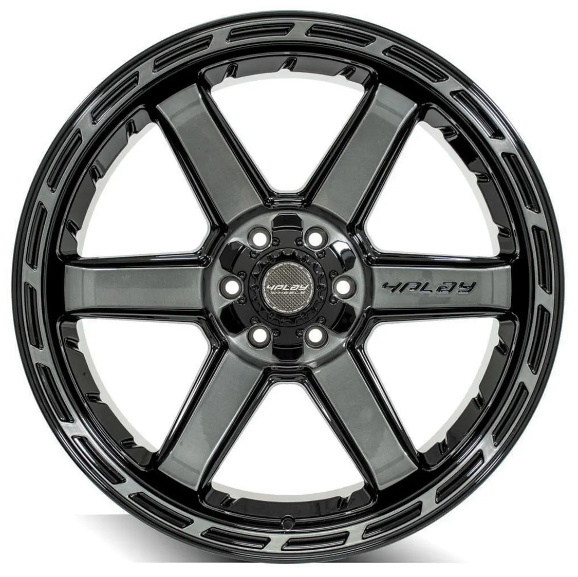 The classic 6-spoke 4P63 wheel is available in four sizes: 20×10, 22×10, 22×12, and 24×14, and offered in both 5- and 6-lug applications. Finished in a peel-resistant, ultra-high-quality gloss black basecoat with a hand-brushed face finished in a beautiful, dark-tinted clearcoat, this wheel (along with the rest of 4Play’s wheel lineup) will retain its rugged good looks for years to come. Select the right size to improve the appearance of your stock, lifted, or leveled pickup truck.
