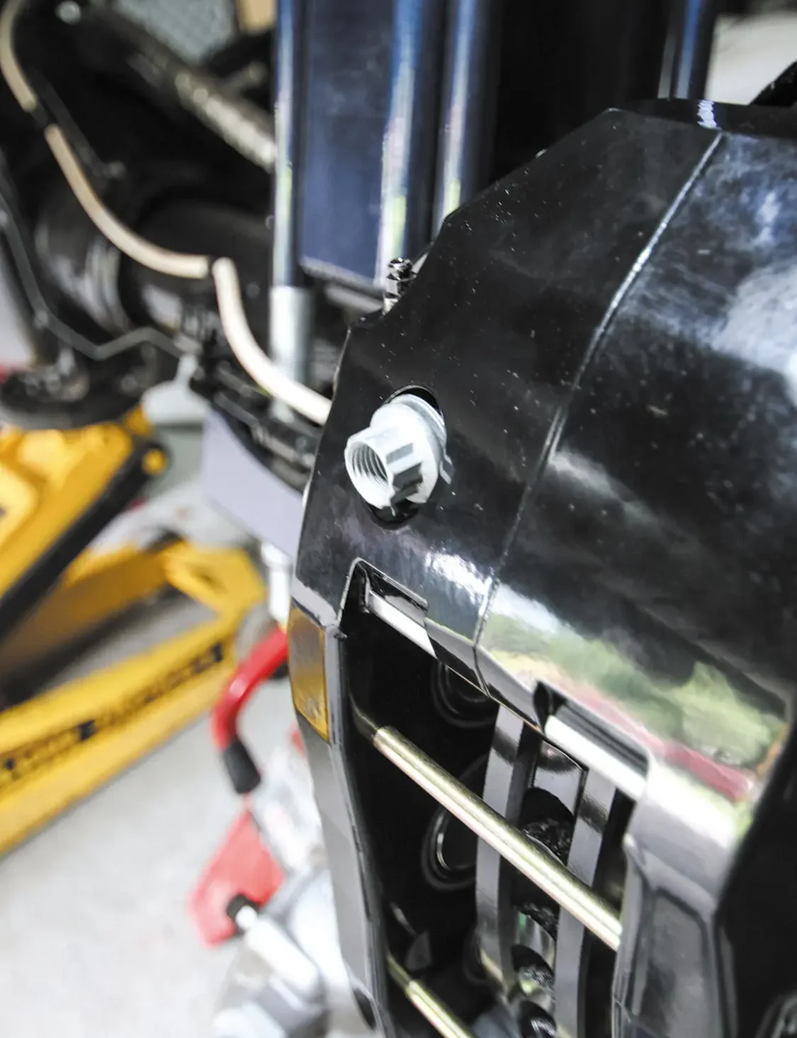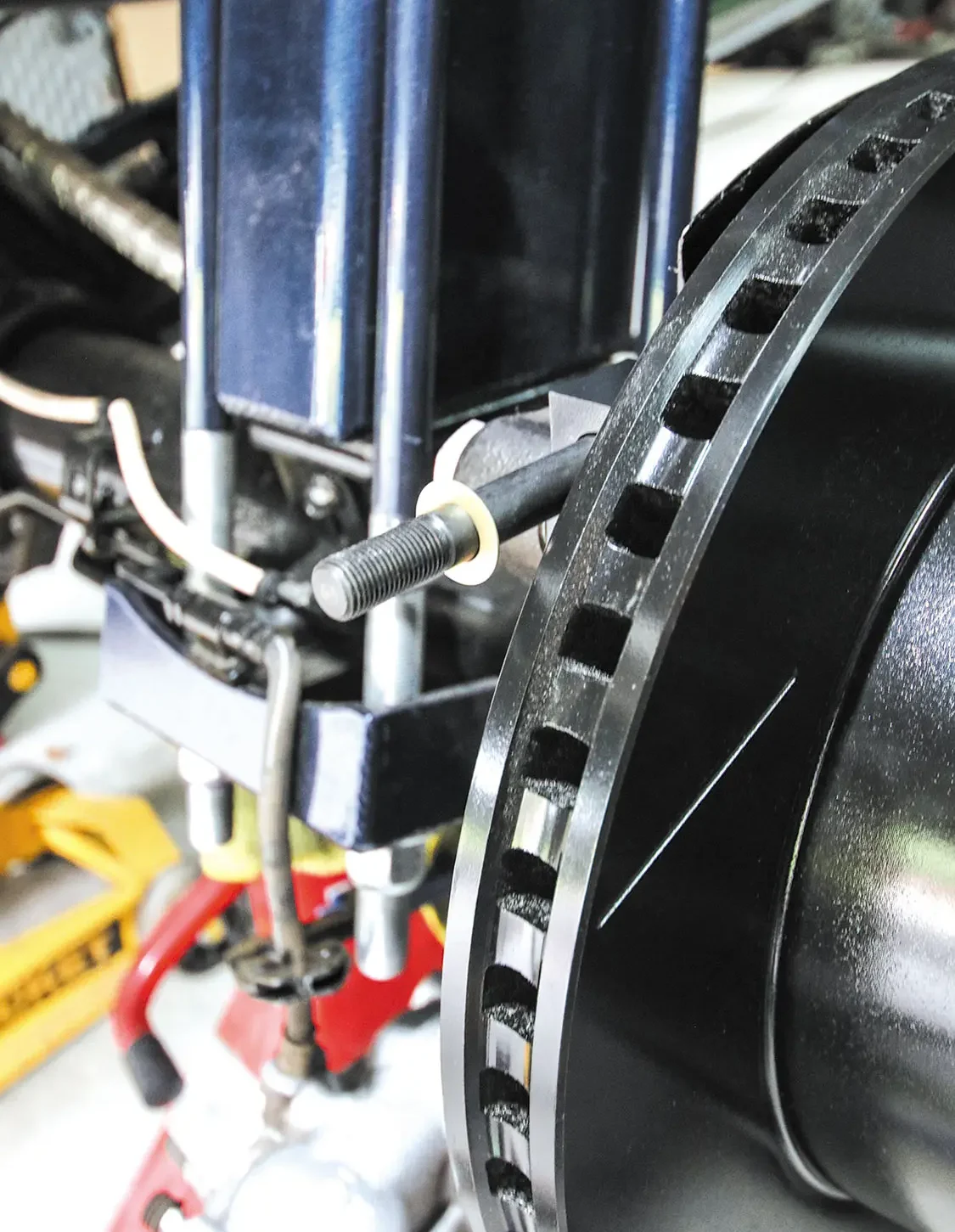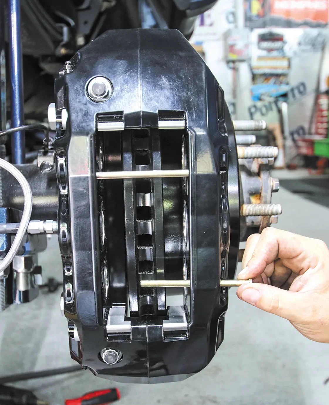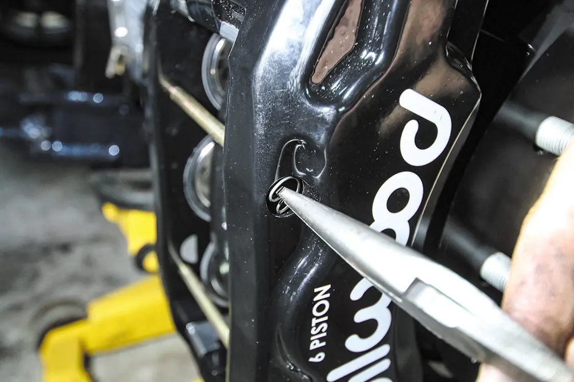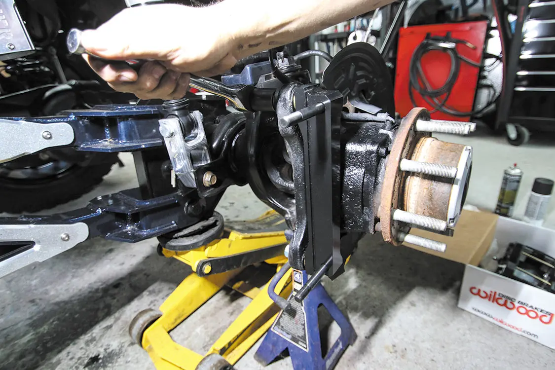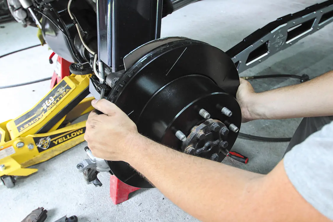 You can put a flathead screwdriver in the caliper opening and push the factory rotor over to compress the caliper pistons and make removing everything a little easier.After you remove the factory caliper, the caliper bracket needs to be removed.The rear rotors require a few knocks with a hammer to get them to release from the axle.As you can see, the factory rear rotor looks a bit rough compared to the Wilwood one. The coating not only protects the rotor from rust, but it also makes it look even better.For this kit, Wilwood requires some of the factory dust shield to be trimmed. This allows better clearance for the larger diameter rotor.Once the dust shield is trimmed, the new rotor just slides into the factory spot.Applying a thread-lock sealant to the caliper bracket bolts ensures they won’t back out due to vibration.The new Wilwood caliper brackets bolt directly to the factory caliper bracket holes.The brake kit comes with several thin washers (shims) to space off the caliper from the rotor just enough. Start with one per bolt and add accordingly to allow the caliper to clear the rotor.The supplied nuts bolt the caliper to the caliper bracket. Snug them up while adding and removing shims to ensure proper caliper placement.Once the caliper is spaced correctly, use Red Loctite and tighten the nuts to secure the calipers to the caliper bracket placement.Unbolt the factory brake line from the axle where the hard line meets the flex line.Connect the supplied steel-braided brake line to the hard line and secure it to the axle. Also connect the other end of the brake line to the back of the new caliper.Remove the pad retaining pins from the calipers to allow room to install the new pads.The supplied brake pads slide into the caliper from the outside. This also makes changing pads down the road easier than a stock set of pads.Once the pads are in and you reinstall the pad retaining pins, lock in the pins with the supplied clips.Once both rear brakes are installed, bleed the brakes to ensure no air is trapped in the lines.As you can see, the new Wilwood rear brakes are not only larger than the factory setup, but they also look better.