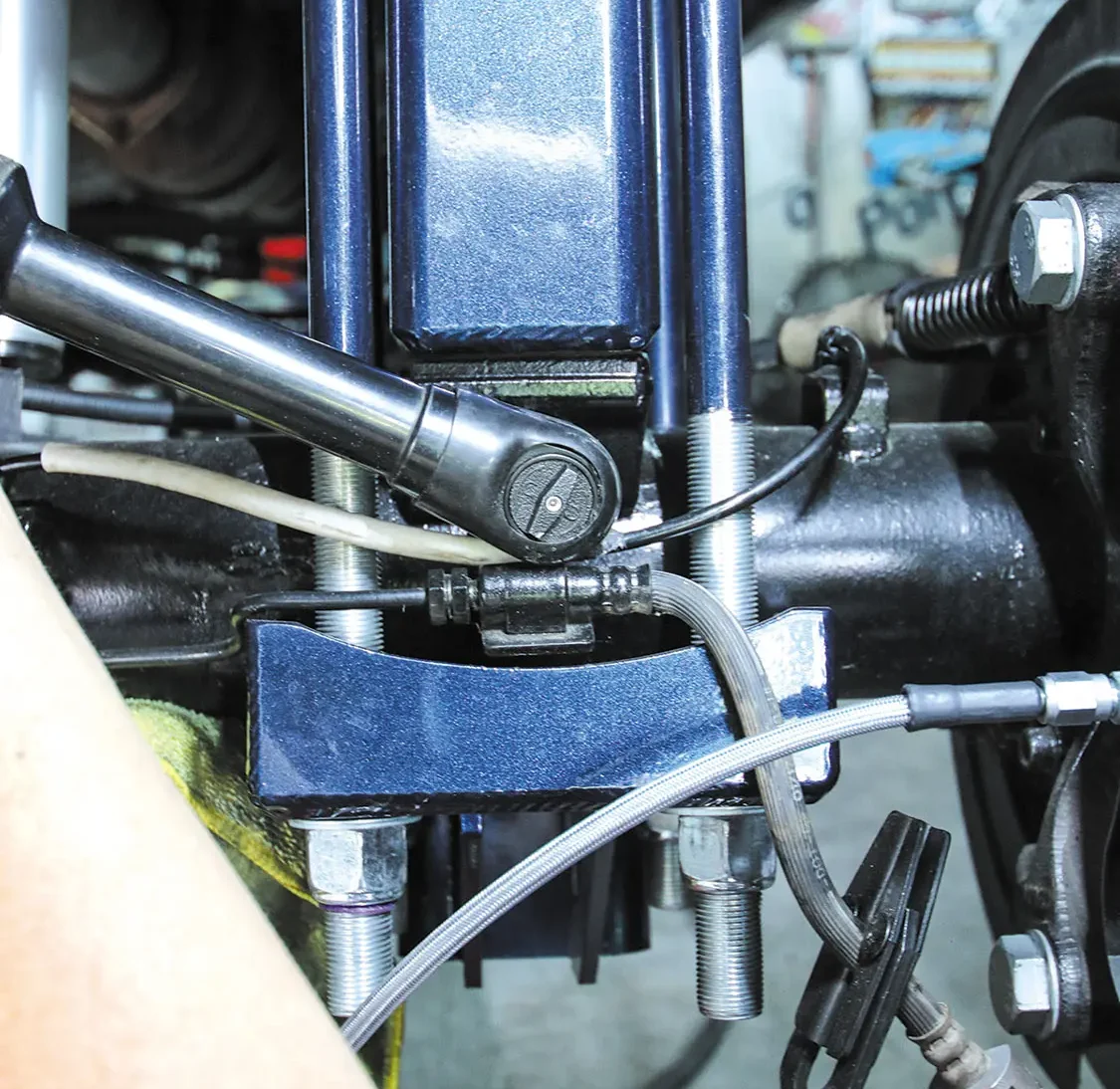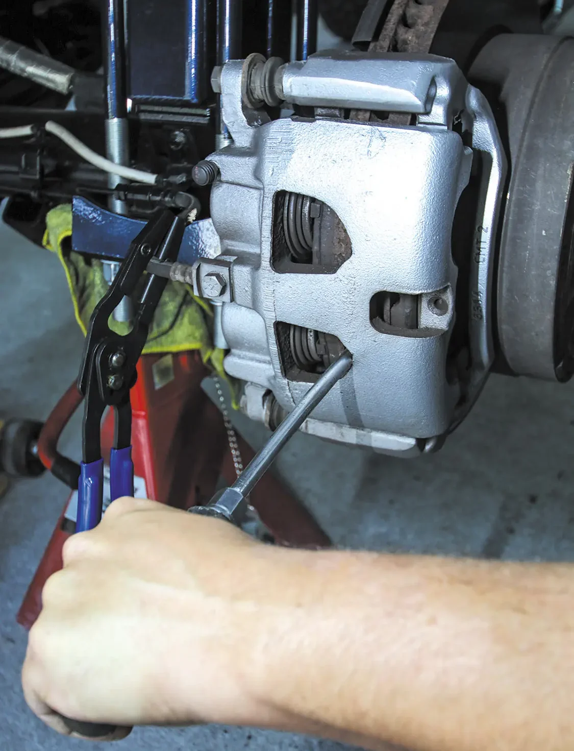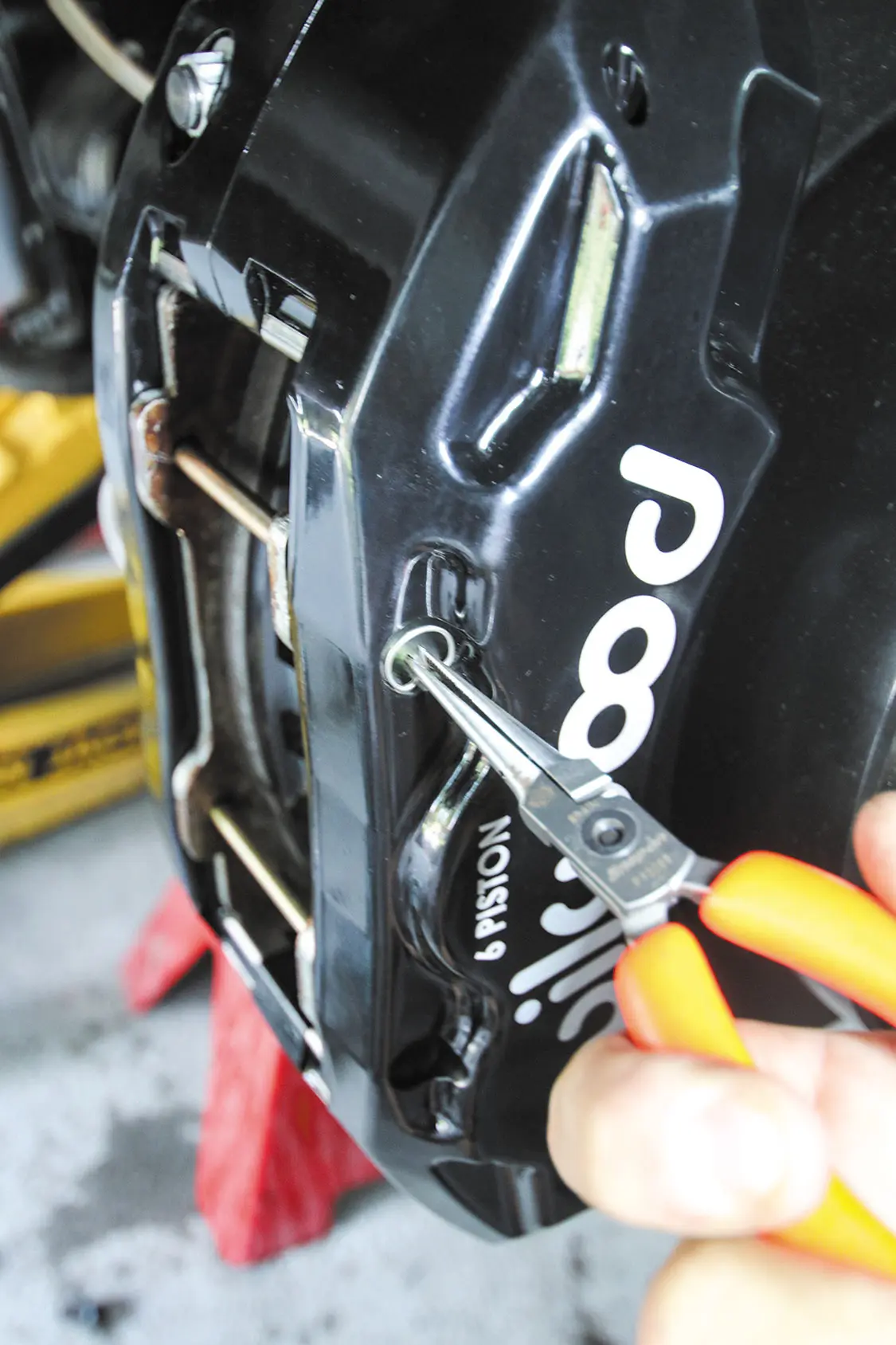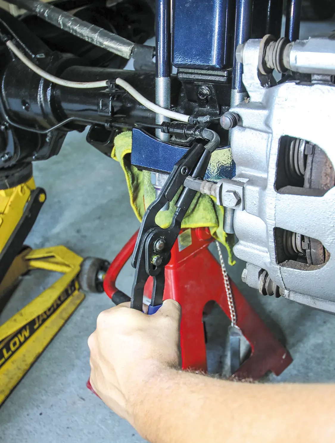 As you can see, the full front and rear kit comes with everything you need for the installation. The front rotors are two-piece for this vehicle, and you get four calipers, all the brackets, new brake lines, hardware, and all-new brake pads.The factory rear brake setup is usually rusty as you can see here, so replacing this with the Wilwood kit makes what you see through the wheels even more eye-catching.Clamping off the flex brake will prevent you from losing a ton of brake fluid. It will also make bleeding the brakes easier while creating less of a mess.