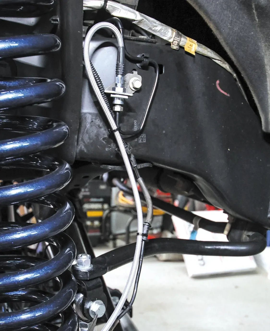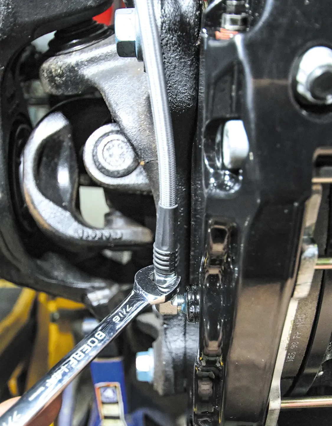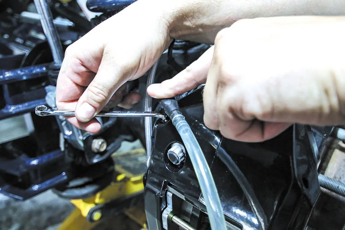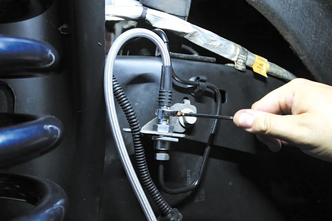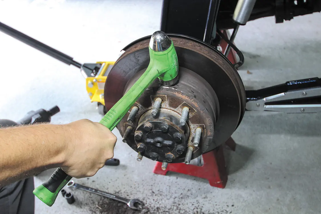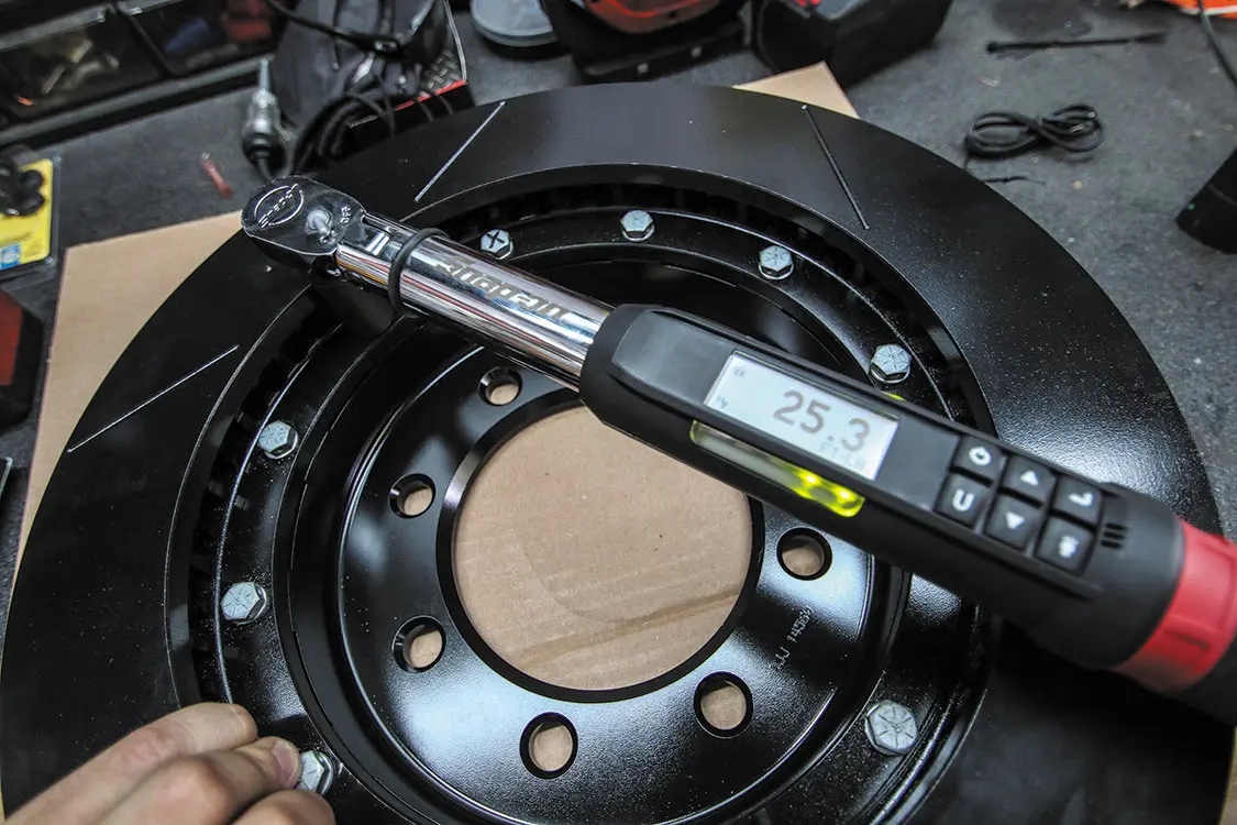 The factory front brakes are just as rusted as those in the rear, so getting rid of them for the better-performing and better-looking Wilwood BigBrake Kit will be a huge upgrade for this truck.The front Wilwood rotors are twopiece, so the rotors and rotor hats need to be bolted together.For this application, the company calls for the rotor bolts to be torqued to 25 lb-ft. Make sure to alternate around the bolt pattern when tightening to ensure even torque.Remove the caliper bolts from the caliper bracket and remove the factory caliper. Just like the rear, clamp the brake flex line to prevent losing brake fluid while the caliper is off.Using a hammer, tap the factory rotor to free it from the spindle.Slide the Wilwood rotor onto the spindle and bolt the new caliper to the caliper bracket just like you did the rear.With the factory rotor and caliper removed, you can bolt the supplied Wilwood caliper bracket to the factory caliper mounting points.The pad retainer pins and retaining clips need to be removed to allow access to install the pads.Slide the new pads into the caliper and reinstall the pad retaining pics and clips to secure the pads.Connect the supplied steel-braided flex line to the back of the caliper. (For this application, we had to order longer lines due to the 10-inch suspension lift, but for a stock-height truck, the supplied lines work perfectly).Attach the other end of the steel-braided flex line to the hardline connector on the frame.Secure the line to the ABS line but make sure the line has plenty of travel for turning and suspension articulation. Make sure nothing is in a bind.Once both sides are installed and tightened down, make sure to bleed the brake lines on both sides.